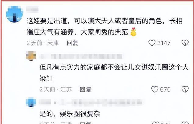 也因为小水晶在视频里的气质过于出众,导致网友说以她的形象和气质,绝对可以在剧里出演 “大夫人”或者“皇后” 的角色。 但也有网友反驳: “有实力的家庭,都不会让儿女进娱乐圈。”